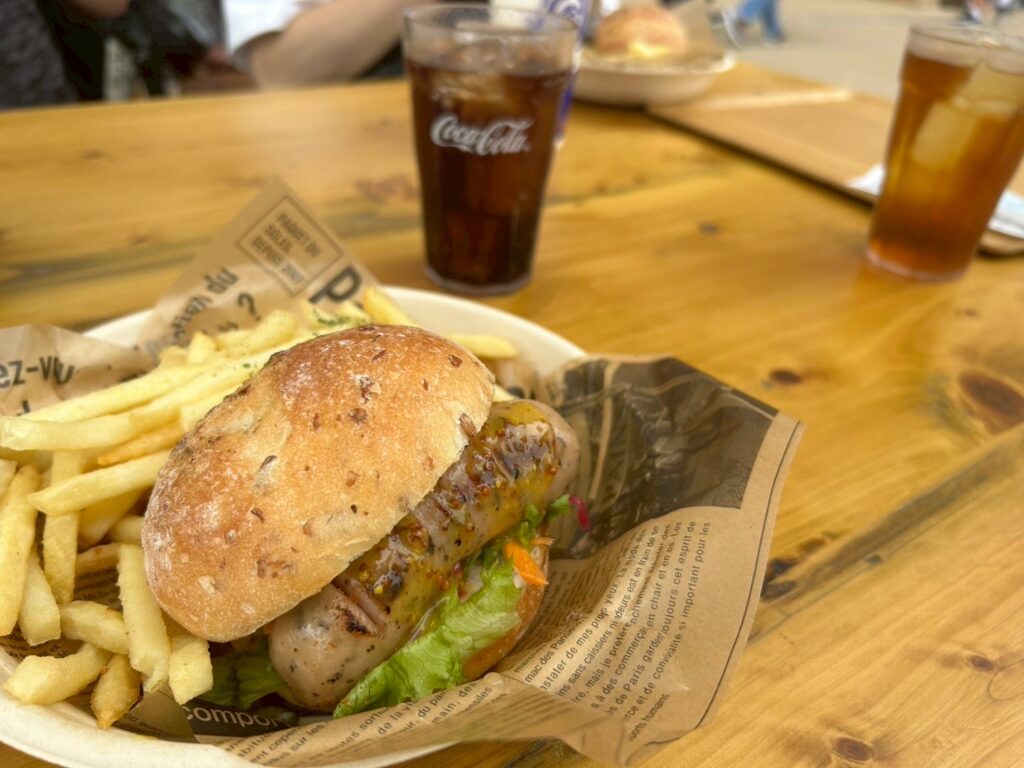 そこで、フードコートのような場所があったので、空いてる席を友人たちと手分けして探して、なんとか席を確保し、比較的空いていたドイツのお店で食事を注文しました。